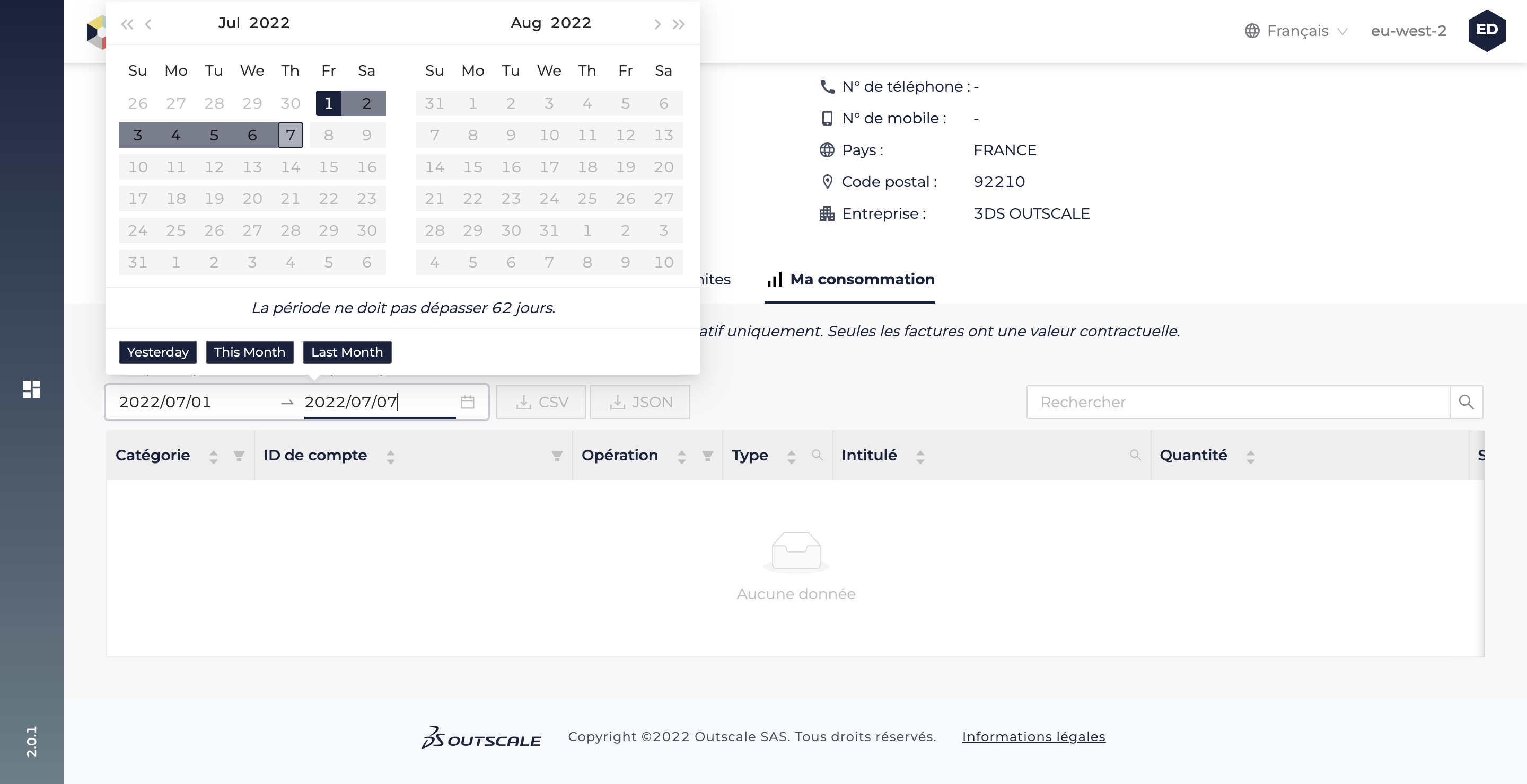 Suivez en temps réel vos ressources actives et bénéficiez d’une vue d’ensemble de votre consommation par unité d’œuvre (sur une période personnalisée allant jusqu’à 62 jours).